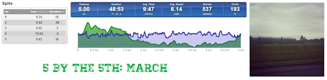 My 5 by the 5th run went okay. As I recall, I was feeling a bit under-the-weather between a headache and what, for some reason, felt like a Herculean effort to maintain my usual pacing. I kept it under a 10-minute mile, but that took some doing.